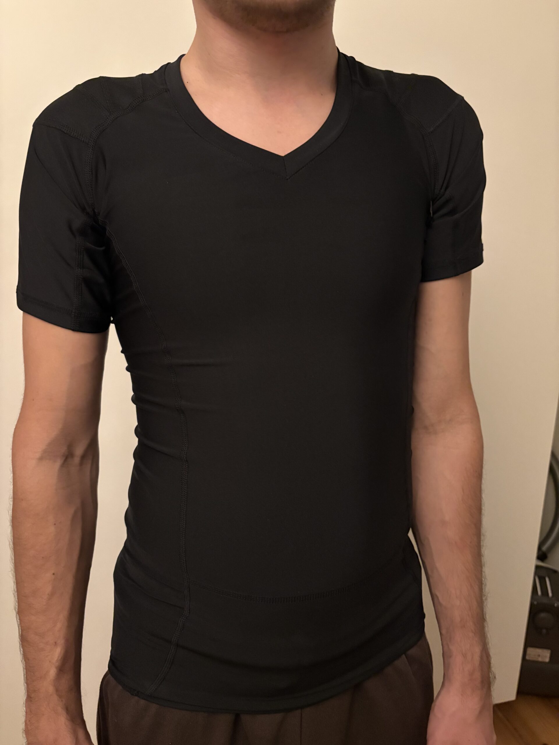 Anodyne Posture Shirt sidder tæt, men ikke ubehageligt, og materialet føles fleksibelt og let mod huden. De første 10–15 minutter er man meget bevidst om trøjen, især omkring skuldrene, men derefter bliver fornemmelsen mere naturlig.