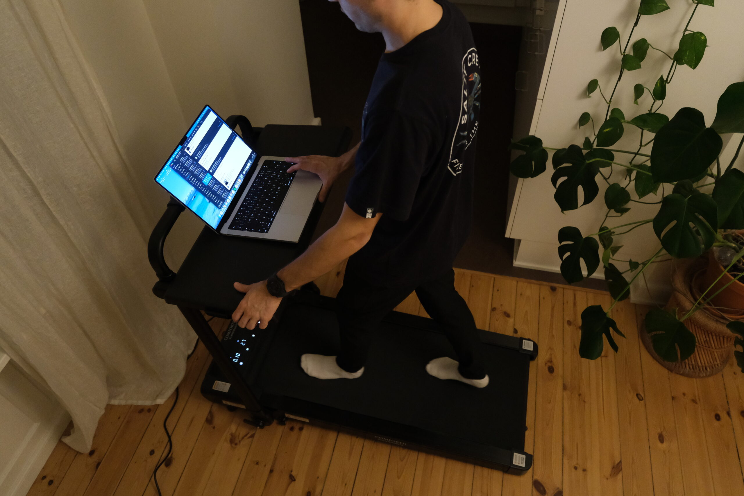 En af de største styrker ved MotionPro er, at det fungerer fremragende sammen med et hæve-sænkebord. Hvis du arbejder hjemmefra, kan du gå i et roligt tempo på 2–4 km/t, mens du svarer mails eller deltager i møder.