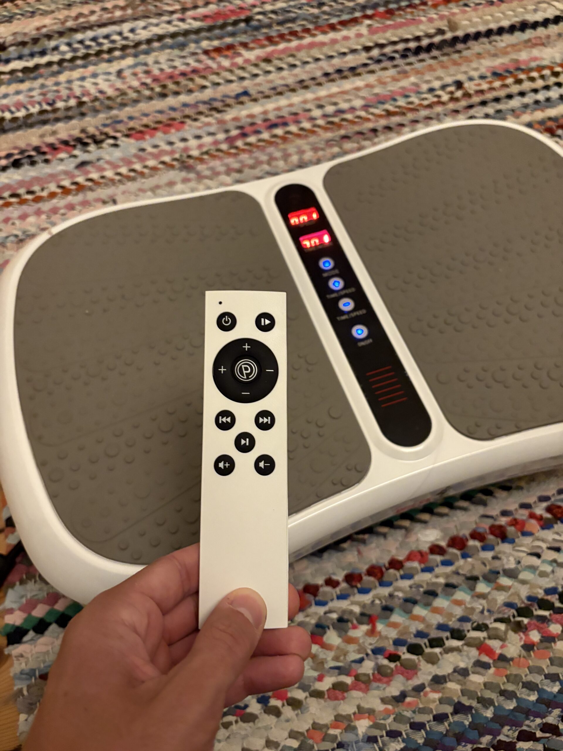 Der medfølger modstandsbånd, så du kan kombinere vibrationstræning med overkropsøvelser, og en fjernbetjening, der gør det nemt at skifte program midt i træningen. En ekstra bonus er, at du kan tilslutte musik via Bluetooth-højttaleren, så træningen bliver lidt sjovere.
