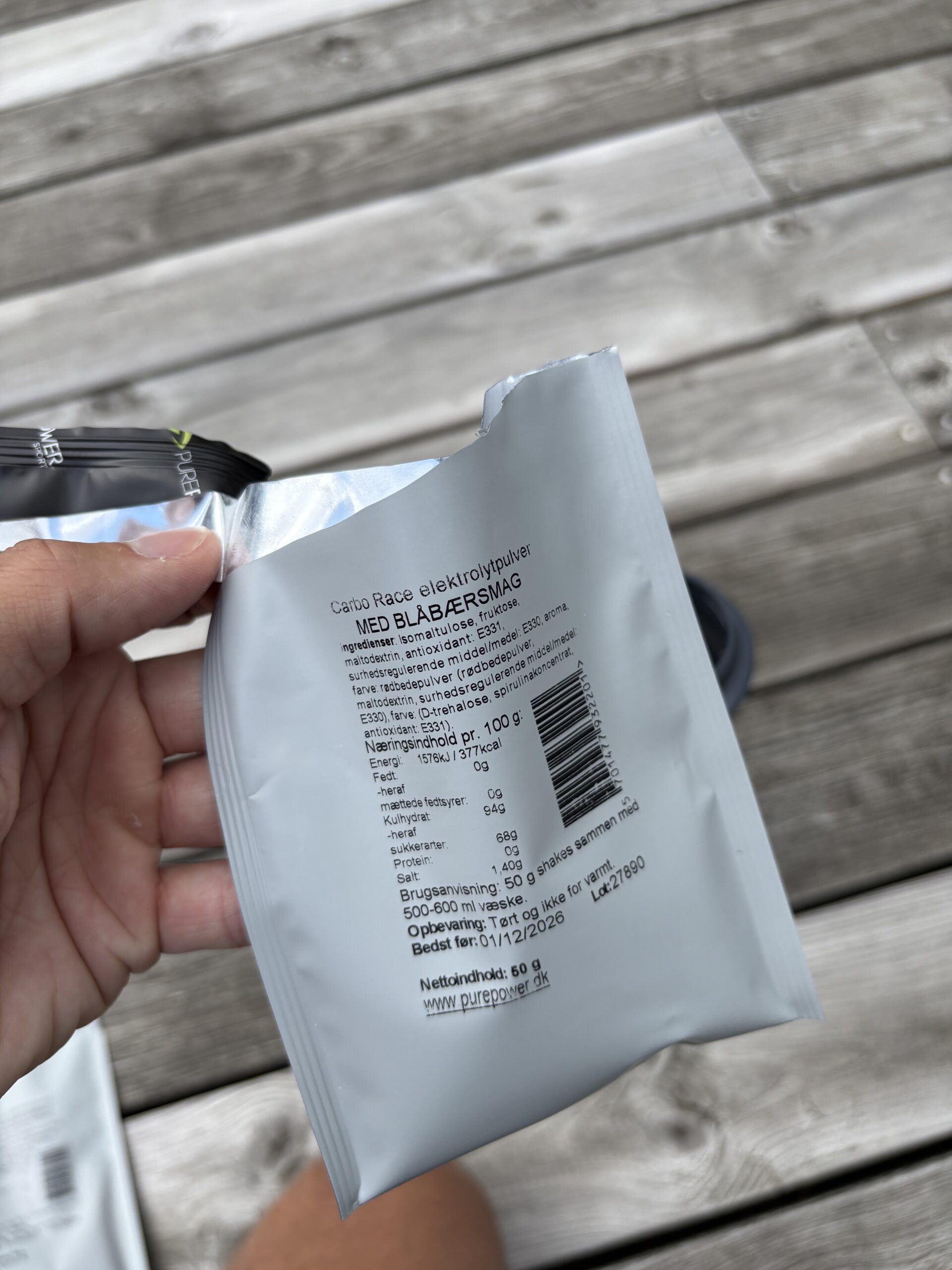 Hver portion indeholder 47 g kulhydrat, der giver kroppen hurtig energi. Derudover er der 0,7 g salt (natrium) pr. portion, som hjælper med at holde elektrolytbalancen stabil. Sammen sikrer det, at du både kan holde tempoet og undgå de klassiske tegn på udmattelse.