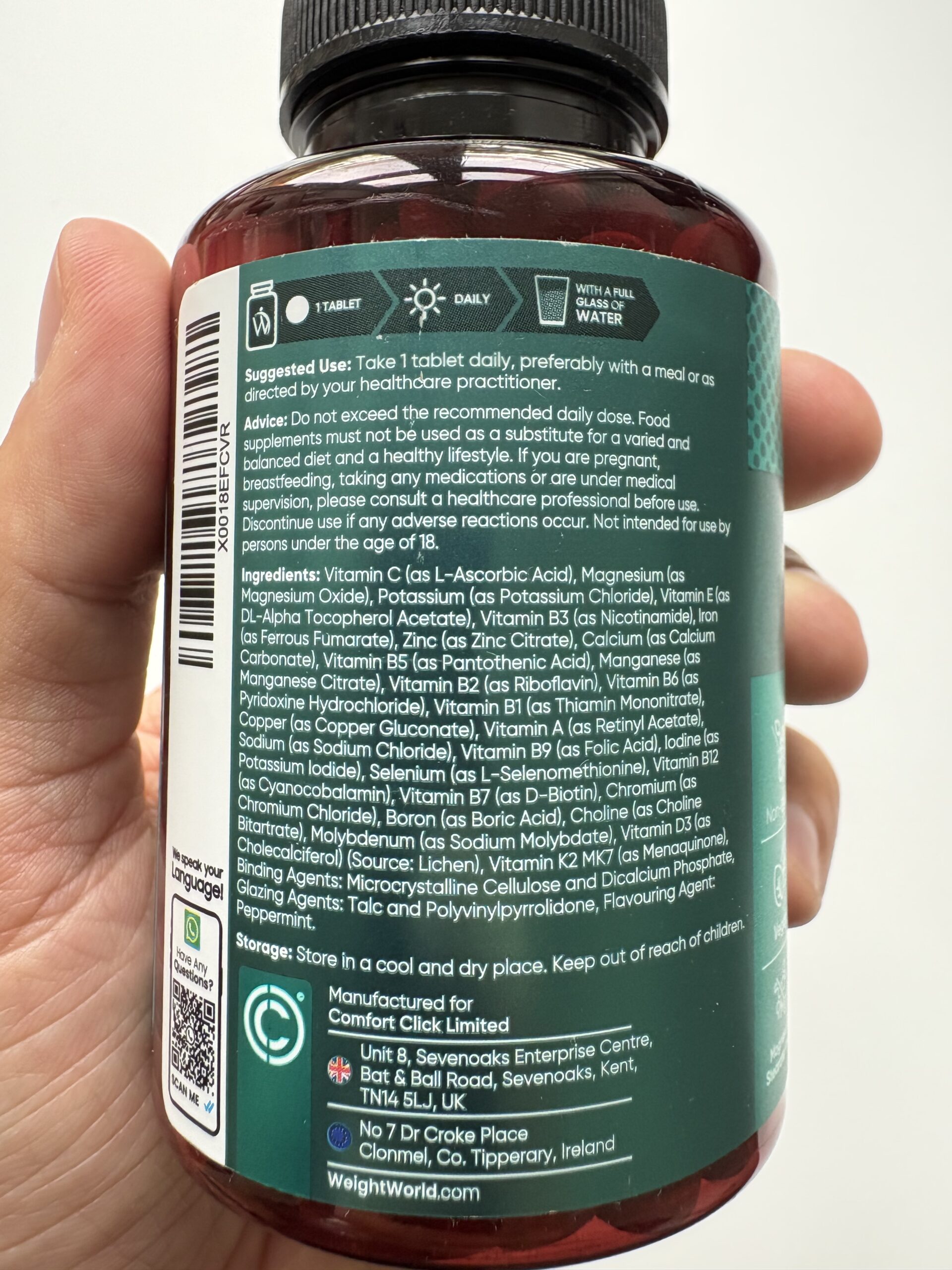 WeightWorlds multivitamin-tabletter er udviklet specielt til voksne, som gerne vil sikre, at kroppen får de nødvendige næringsstoffer til at fungere optimalt. Produktet indeholder en bred vifte af vitaminer (A, B, C, D, E og K) og mineraler som calcium, magnesium, jern, zink, kobber, jod, mangan og selen. Tilsammen støtter de alt fra immunforsvar, energi og nervesystem til hud, hår, negle, knogler og tænder.